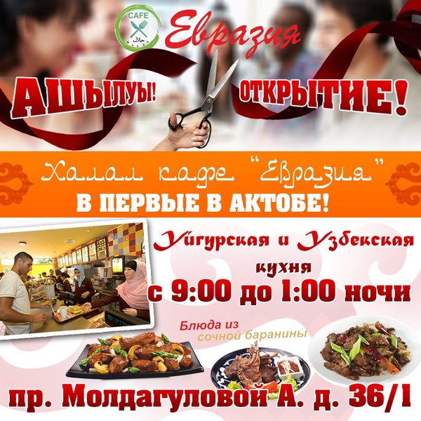 в первые в Актобе халал кафе «Евразия» Приглашаем вас на открытие!попробовать вкуснейшие блюда: Уйгурской, Узбекской, Европейской и Японской кухни, приходите с семьей или друзьями!