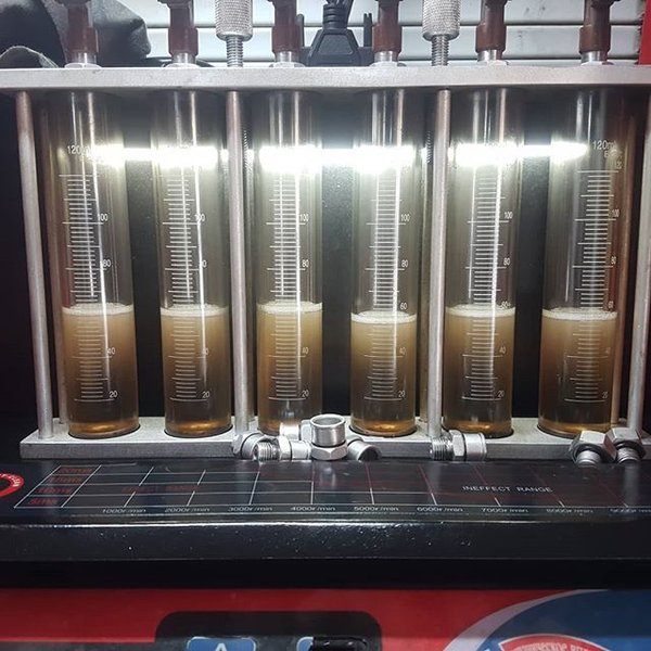 Валерий Лаврик (24.05.2019): перед каждой чисткой форсунок в ультразвуке мы проверяем их на стенде, вот результат 2 из 6ти форсунок капают в спокойнлм состоянии и неравномерная проливка. После чистки будут как новые. Обслуживайтесь на правильном автосервисе тел.для записи тел.