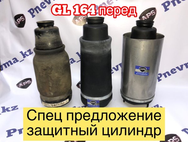 Реставрация подушки GL 164 перед 80000тг + дополнительно можем установить защитный цилиндр, стоимость 10000. Защитный цилиндр предназначен для предотвращения механического повреждения резиновой части пневмоподушки. Особенно популярна эта услуга для любителей выезжать за город и любителей использовать свой внедорожник по максимуму.