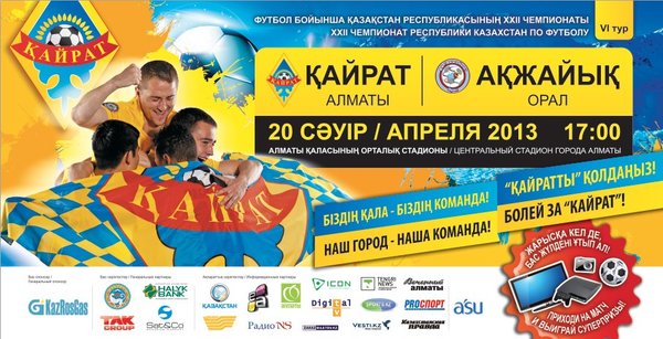 ФК Кайрат (16.04.2013): Любители футбола! Приглашаем всех вас поддержать наш Алматинский «Кайрат» в матче VI тура против «Акжайыка» из Уральска! 20 апреля. Центральный стадион г. Алматы. Начало матча в 17:00. Наш город, наша команда! Болей за «Кайрат»!