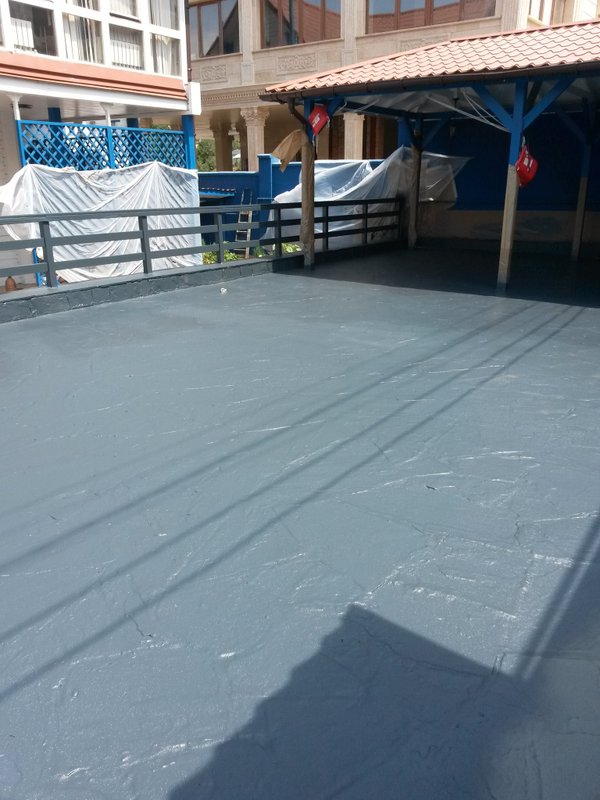 очень не удобно для хозяев дома. В частном доме людям хочется тишины и покоя, уединения, а тут целыми днями с утра до ночи ходят толпы рабочих которые стучат, гремят, пилят и т.д. Наша компания Line-x PC Kazakhstan решила эту проблему менее чем за неделю. Двор был покрыт продуктом xs-152 атроцитово-серого цвета (цвет был выбран клиентом). Xs-152 не поддерживает горения. Line-x имеет широкую линейку прочных и эластичных продуктов гидроизоляции, плюс материалу можно предать любой цвет и оттенок. Хозяин очень доволен и при этом съэкономил деньги!