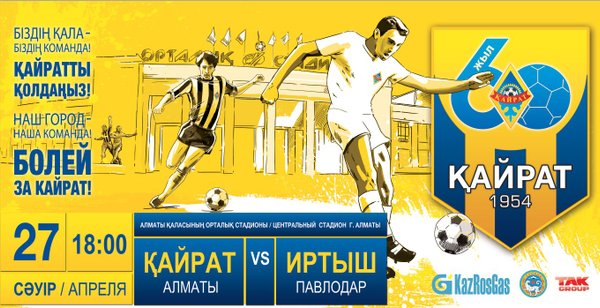 ФК «Кайрат» (22.04.2014): Друзья! Приглашаем всех вас поддержать Наш клуб в матче VIII тура Премьер-Лиги, где «Кайрат» принимает «Иртыш» из Павлодара Начало игры — в 18:00, но рекомендуем заходить на стадион пораньше, чтоб не пропустить интересные предматчевые мероприятия! 27 апреля. Центральный стадион. «Кайрат» — «Иртыш». Наш город, наша команда! Болей за «Кайрат»!