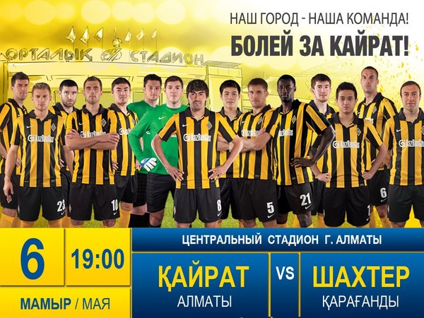 ФК «Кайрат» (02.05.2014): Друзья! Приглашаем всех вас поддержать Наш клуб в матче X тура Премьер-Лиги, где «Кайрат» принимает «Шахтер» из Караганды! Начало игры — в 19:00, но рекомендуем заходить на стадион пораньше, чтоб не пропустить интересные предматчевые мероприятия! 6 мая. Центральный стадион. «Кайрат» — «Шахтер». Наш город, наша команда! Болей за «Кайрат»!