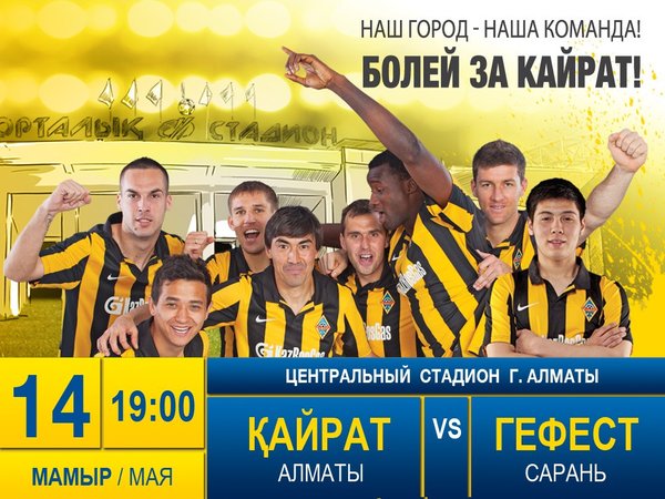 ФК «Кайрат» (10.05.2014): Друзья! Приглашаем всех вас поддержать Наш клуб в матче 1/8 финала Кубка Казахстана, где «Кайрат» принимает «Гефест» из города Сарань! Начало игры — в 19:00, но рекомендуем заходить на стадион пораньше, чтоб не пропустить интересные предматчевые мероприятия! 14 мая. Центральный стадион. «Кайрат» — «Гефест». Наш город, наша команда! Болей за «Кайрат»!