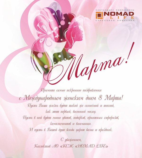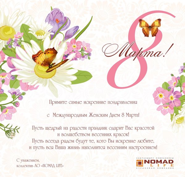 Дорогие, милые женщины! Примите самые искренние поздравления с Международным женским днем 8 Марта! Пусть этот день подарит вам прекрасное настроение, исполнение всех сокровенных желаний! Пусть он станет стартом для новых начинаний, которые принесут только радость! Искренних Вам комплиментов и добрых слов!