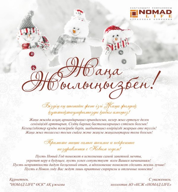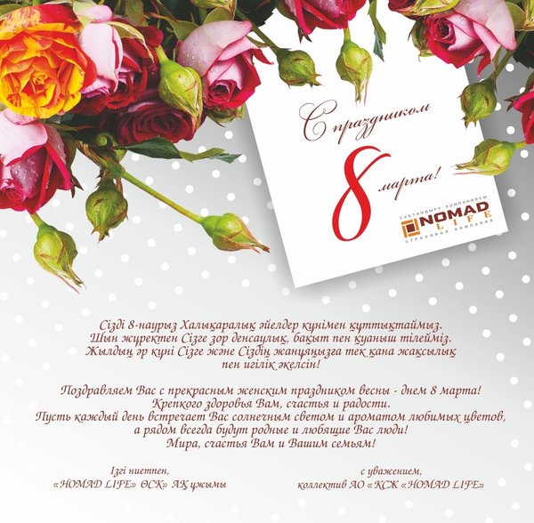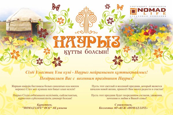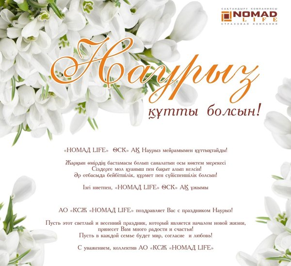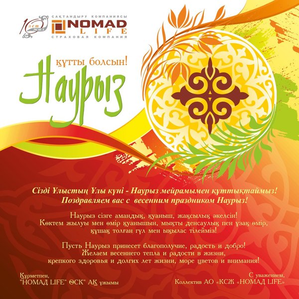 Уважаемые соотечественники! АО «КСЖ „НОМАД LIFE“ поздравляет вас с Наурызом! Пусть этот праздник принесет в жизнь новые и хорошие изменения!