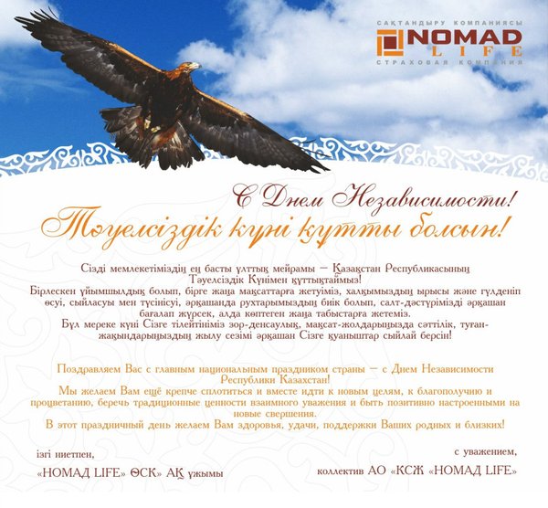 Уважаемые казахстанцы! Поздравляем вас с Днем Независимости Республики Казахстан! Желаем вам и вашим близким крепкого здоровья, счастья и благополучия. Пусть всегда вам сопутствует удача!