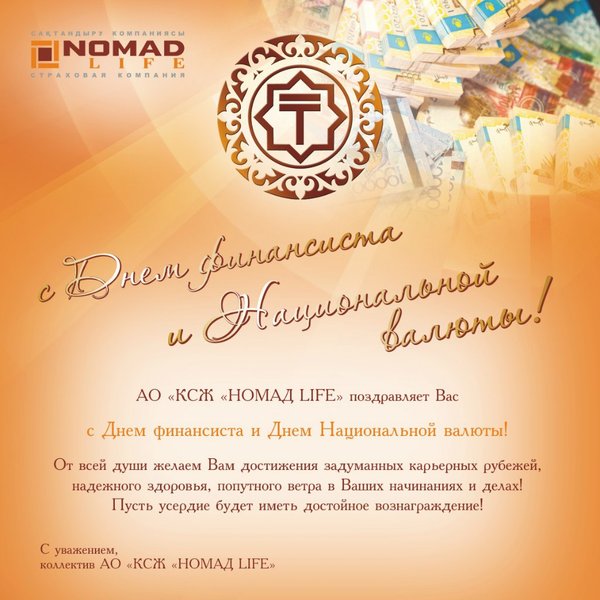 Уважаемые казахстанцы! Примите наши поздравления с Днем Национальной валюты и Днем финансиста! Пусть в ваших семьях будет благополучие, мир и согласие!