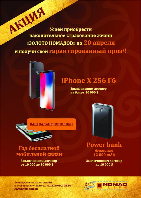 Уникальная валютная программа «Золото Номадов» — Выгодная альтернатива банковским депозитам — Удобные сроки страхования — Ваша жизнь под страховой защитой круглосуточно в любой точке мира Подарки для первых клиентов: iPhone X, год мобильной связи или power bank. Успейте получить свои подарки! Подробнее на сайте:
