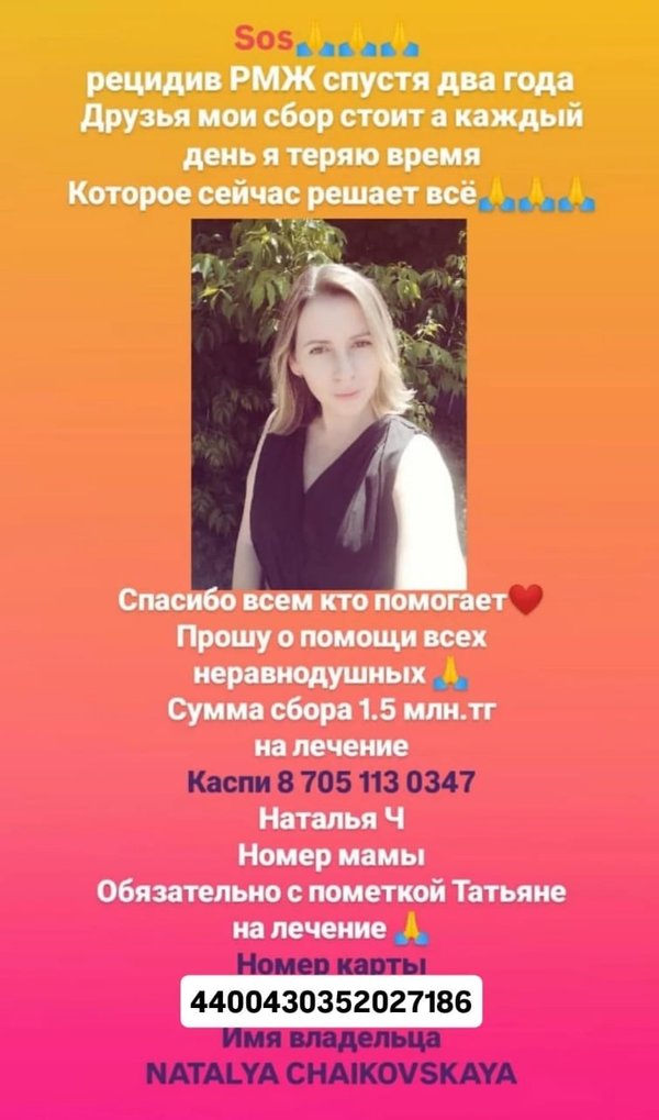 Каспи банк: Тел.: Наталья Ч. Номер мамы. Обязательно с пометкой *Татьяне на лечение*