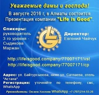 2-декабря 2017 г. в 12 часов в гостинице состоится презентация компании Life is Good. Спикер: Советник Президента, зам председателя правления ЖК Бест Вей Евгений Чайчук запись по телефону, вацап
