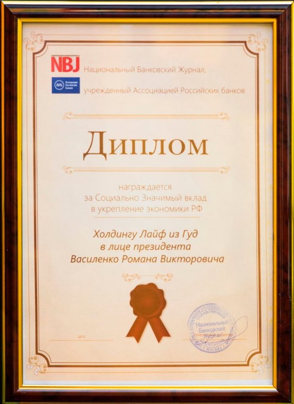 Диплом «за Социально Значимый вклад в укрепление экономики РФ» — холдингу Life is Good