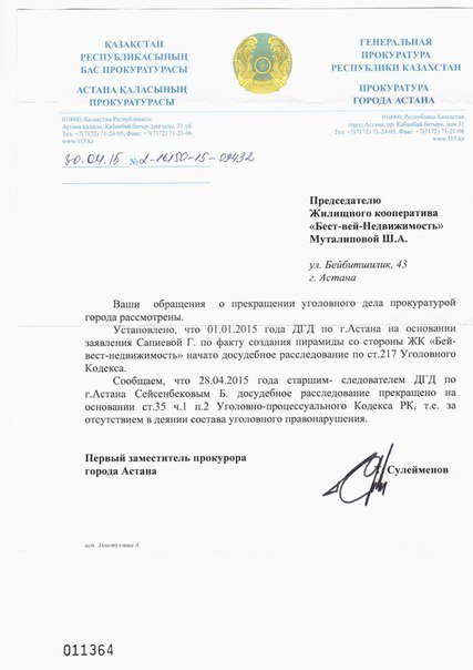 В конце 2014 г., начале 2015 г. в Прокуратуру г. Астаны (Казахстан) было подано несколько заявлений с просьбой провести проверку добросовестности действий организаторов проекта Бест Вей — Недвижимость, подозревая кооператив в работе по принципу пирамиды. 30 апреля 2015 г. было получено официальное письмо от Прокуратуры Казахстана, в котором сказано, что В деянии отсутствует состав уголовного правонарушения. То есть результат проверки со стороны Прокуратуры выявил, что ЖК Бест Вей Недвижимость не является пирамидой.