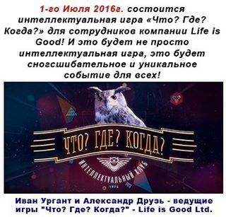 Игру «Что Где Когда» ведет знаменитый магистр Александр Друзь и при участии клуба «Nontrivial»; ВЕДУЩИЙ ВЕЧЕРА: Российский актёр, телеведущий, музыкант, шоумен, продюсер – ИВАН УРГАНТ!