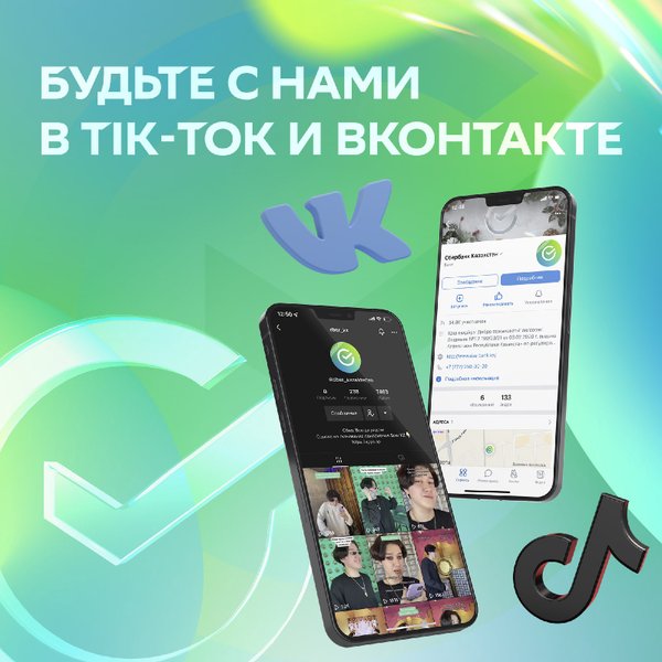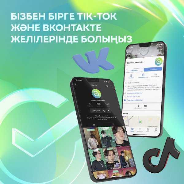 Сбербанкке Tik-Tok және ВКонтакте желілерінде жазылыңыз ⠀ Бұл платформаларда сізді пайдалы ақпарат пен Сбербанктің ең өзекті жаңалықтары күтеді. Бізбен бірге болыңыз және барлық қызықтан хабардар болыңыз! Біз сізге ыңғайлы болу үшін барлық әлеуметтік желілерді белсенді жүргіземіз