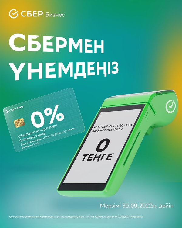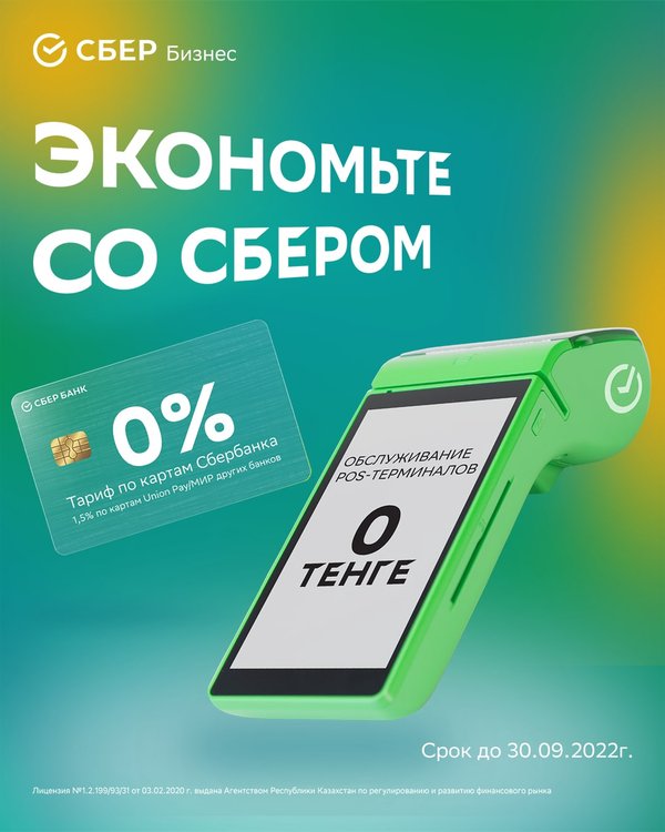 Бізбен бірге үнемдеңіз ⠀ Сбербанктің POS-терминалдарында тиімді шарттар бойынша қолма-қол жасалмайтын төлемдерді қабылдаңыз: ⠀ 0% комиссия – Сбербанк Қазақстан карточкалары үшін (Visa/MasterCard/UnionPay/Мир); 1,5% комиссия – басқа ЕДБ карточкалары үшін (UnionPay/Мир). ⠀ Терминалдарға қызмет көрсету – 0 теңге! ⠀ Жеңілдетілген тарифтің қолданылу мерзімі: 18.03.2022 жылдан бастап 30.09.2022 жылды қоса алғанға дейін. ⠀ Толығырақ 7744 нөмірі арқылы және банк бөлімшелерінде біле аласыз.