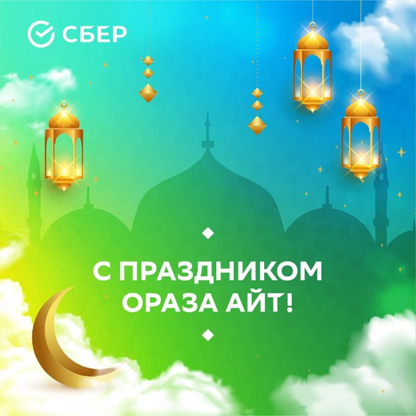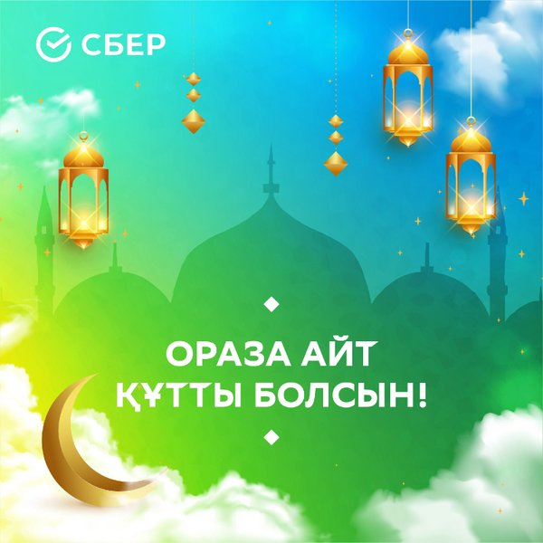 Біз баршаңызды қасиетті Ораза айт мерекесімен шын жүректен құттықтаймыз! Өмірлеріңіз жылулыққа, жүректеріңіз мейірімге толы болсын. Мереке сізге және жақындарыңызға бақыт, құт-береке алып келсін! ⠀ Махаббатпен, СберБанк