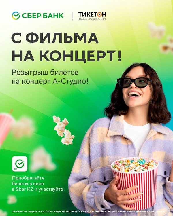 Мы открываем портал на концерт прямо из кинотеатра ⠀ В честь своего десятилетия, Тикетон устраивает праздничный концерт и совместно со СберБанком разыгрывает три билета, каждый на две персоны. ⠀ На мероприятии вас ждёт выступление Группы Орда, Мираса Жугунусова, группы Ninety One и хедлайнера вечера — группы A-STUDIO. ⠀ Розыгрыш проходит только для наших клиентов, купивших билеты в кино в приложении Sber KZ в период с 4 по 10 мая. Результаты объявим 11 мая на странице ⠀ Желаем удачи!