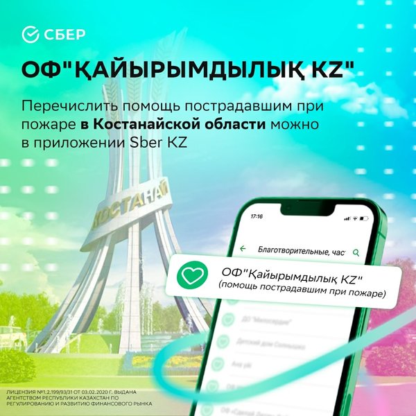 Как помочь пострадавшим при пожаре в Костанайской области через приложение Sber KZ? ⠀ Чтобы перечислить средства в Единый общественный фонд для помощи пострадавшим при пожаре в Костанайской области ОФ «ҚАЙЫРЫМДЫЛЫҚ KZ», необходимо пройти по ссылке в шапке профиля, либо в приложении, перейти в раздел “Операции” — “Все платежи” — “Благотворительность” – “Благотворительные, частные фонды» – ОФ «ҚАЙЫРЫМДЫЛЫҚ KZ». ⠀ Далее, ввести номер ИИН и сумму взноса.