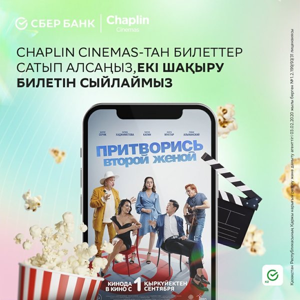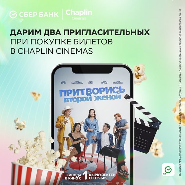 Маршрут построен! ⠀ Друзья, отправляемся за вкусным попкорном и киноновинками в сервис «Кино» прямо в приложении Sber KZ ⠀ Также при покупке билетов в кинотеатр сети Chaplin Cinemas вы получите 2 пригласительных билета на фильм «Притворись второй женой» ️ ⠀ Ну что, готовы отправиться в мини-отпуск вместе со Sber? ⠀ Место встречи — кинотеатр Chaplin Cinemas.
