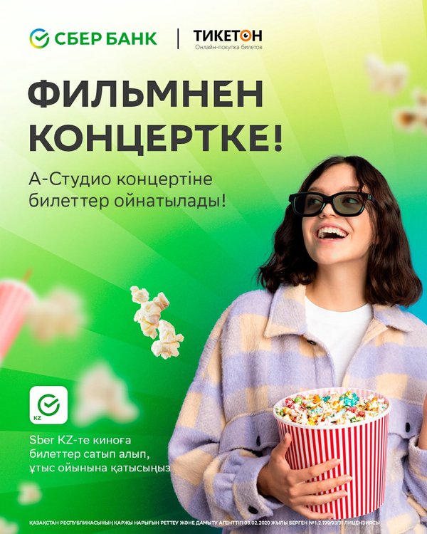 Біз концертке тікелей кинотеатрдан портал ашамыз Тикетон өзінің он жылдығына орай мерекелік концерт ұйымдастырады және СберБанкпен бірлесіп үш билет ойнатады, бір билет екі адамға беріледі. ⠀ Іс-шарада Орда тобының, Мирас Жүгінісовтің, Ninety One тобының және кештің хедлайнері A-STUDIO тобының өнерін тамашалай аласыз. Ұтыс ойыны 4 мамырдан 10 мамырға дейінгі кезеңде (қоса алғанда) тек Sber KZ қосымшасында киноға билет сатып алған клиенттер арасында өтеді. Нәтижелерін 11 мамырда парақшасында жариялаймыз. Сәттілік тілейміз!