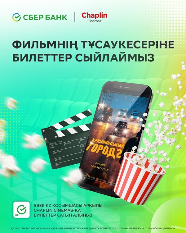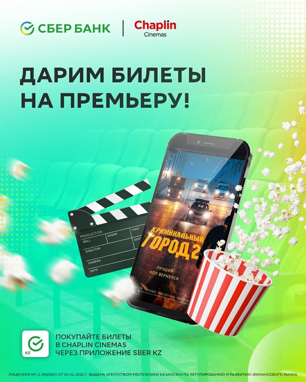 Покупайте билеты в Chaplin Cinemas, через приложение Sber KZ и участвуйте в розыгрыше! ⠀ 25 счастливчиков получат по 2 билета на «Криминальный город 2» ⠀ 50 билетов в ожидании своих победителей ⠀ Подробнее читайте на сайте sber.kz ⠀ До встречи в Chaplin Cinemas