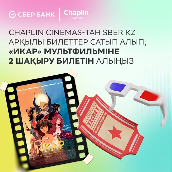 Сізді киноға шақырамыз! ⠀ Sber KZ қосымшасы арқылы Chaplin Cinemas-қа билеттер сатып алып, «Икар» мультфильміне 2 шақыру билетін сыйлыққа алыңыз! ⠀ Билеттерді бар болғаны бір-екі рет басу арқылы сатып алыңыз: Sber KZ — Сервистер — Кино. ⠀ Chaplin-де кездескенше
