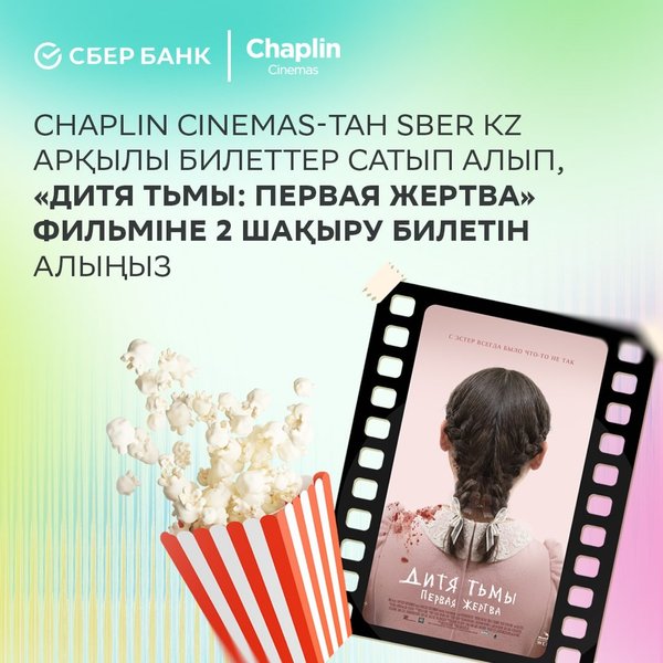 Сізді киноға шақырамыз! ⠀ Sber KZ қосымшасы арқылы Chaplin Cinemas-қа билеттер сатып алып, «Дитя тьмы: Первая жертва» фильміне 2 шақыру билетін сыйлыққа алыңыз! ⠀ Билеттерді бар болғаны бір-екі рет басу арқылы сатып алыңыз: Sber KZ — Сервистер — Кино. ⠀ Chaplin-де кездескенше