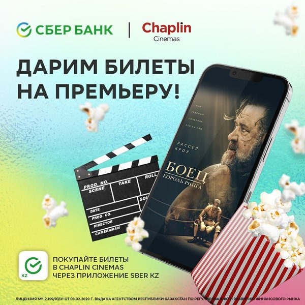 Приглашаем вас в кино! ⠀ Покупайте билеты в Chaplin Cinemas через приложение Sber KZ и получите 2 пригласительных билета на мультфильм «Икар» в подарок! ⠀ Купите билеты всего за пару кликов: Sber KZ — Сервисы — Кино. ⠀ Встретимся в Chaplin