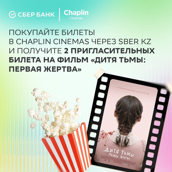 Приглашаем вас в кино! ⠀ Покупайте билеты в Chaplin Cinemas через приложение Sber KZ и получите 2 пригласительных билета на фильм «Дитя тьмы: Первая жертва» в подарок! ⠀ Купите билеты всего за пару кликов: Sber KZ — Сервисы — Кино. ⠀ Встретимся в Chaplin