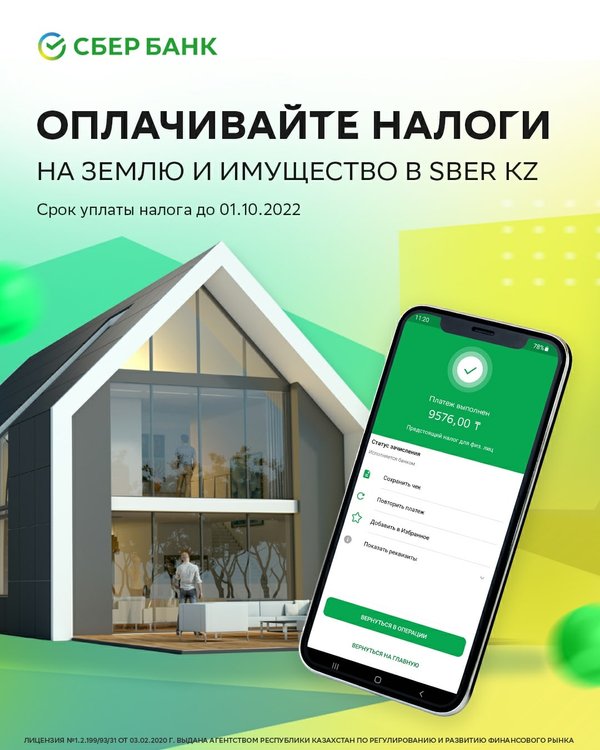 Уважаемые клиенты! ⠀ Напоминаем, что срок уплаты налога на землю и имущество за 2021 г. – до 01 октября 2022 г. ⠀ Оплатить налог вы можете в нашем мобильном приложении Sber KZ — без комиссий и очередей, всего в несколько шагов: 'Операции» -> «Все платежи» -> «Штрафы, налоги, гос.услуги» –> «Налоги» –> «Предстоящий налог для физ.лиц». ⠀ После этого вам остается ввести номер ИИН и сумма налога отразиться автоматически. Квитанцию об оплате можно найти во вкладке «История».