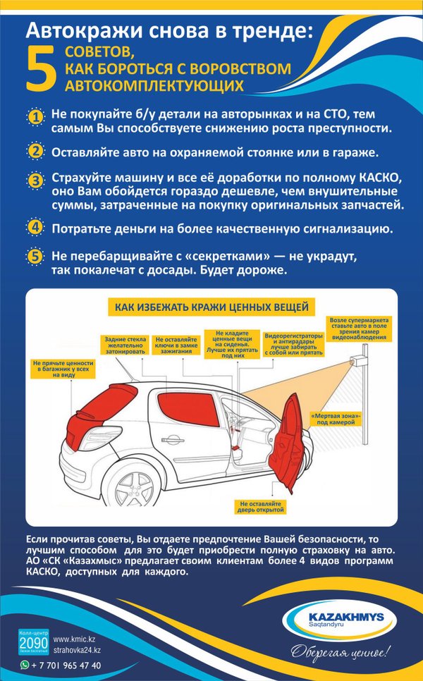 яйте авто на охраняемой стоянке или гараже, не бросайте где-попало; Страхуйте машину и все её доработки по полному КАСКО, оно Вам обойдется гораздо дешевле, чем изложенные выше суммы Потратьте деньги на более качественную сигнализацию; Не перебарщивайте с секретками не украдут, так покалечат с досады. Будет дороже. Вы можете рассчитать стоимость КАСКО на нашем сайте