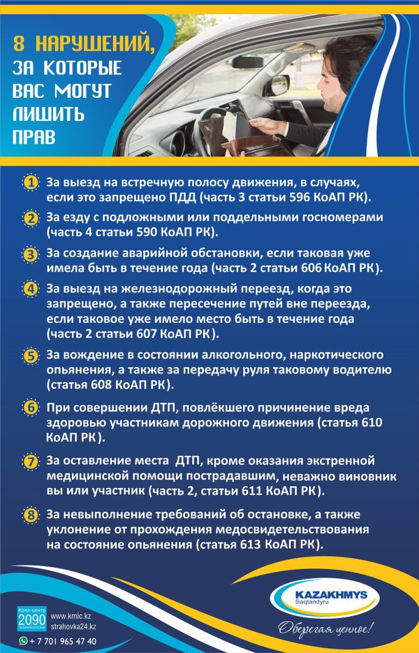 гней, противотуманок штраф 5 МРП = 10605 тенге (ст. 464 КоАП). Использование телефона или радиостанции, будучи за рулем штраф5 МРП = 10605 тенге (ст. 591 КоАП). Управление транспортным средством с не пристегнутым ремнем безопасности штраф 5 МРП = 10605 тенге (ст. 463 КоАП). Превышение скорости (ст. 592 КоАП): на 10—20 км/ч штраф 10 МРП = 21210 тенге; на 20—40 км/ч штраф 15 МРП = 31815 тенге; более 40 км/ч штраф 30 МРП = 63630 тенге; при повторном превышении скорости в течение года штраф 40 МРП = 84840 тенге. Выезд на перекресток или проезжую часть, который привел к затору в поперечном направлении штраф 10 МРП = 21210 тенге (ст.594 КоАП). В случае невыполнения требования ПДД уступить дорогу транспорту с преимущественным правом штраф 15 МРП = 31815 тенге (ст. 594 КоАП). Перестроение, поворот, разворот или остановка без предупреждающего сигнала штраф 5 МРП = 10605 тенге (ст.595 КоАП). Разворот или движение задним ходом, где они запрещены штраф 10 МРП = 21210 тенге (ст. 595 КоАП). Движение по пешеходным дорожкам, обочинам или тротуарам штраф15 МРП = 31815 тенге (ст. 596 КоАП). Нарушение правил остановки или стоянки, предусмотренных ПДД штраф 10 МРП = 21210 тенге (ст. 597 КоАП). Остановка или стоянка транспортных средств на тротуаре, клумбах, детской или спортивной площадке 15 МРП = 31815 тенге (ст. 597 КоАП). Стоянка или остановка на местах, отведенных для остановки или стоянки транспортных средств инвалидов штраф 50 МРП = 106050тенге (ст. 597 КоАП). Проезд на запрещающий сигнал светофора или жест регулировщика штраф 10 МРП = 21210 тенге (ст.599 КоАП). Создание аварийной обстановки, вынуждение других участников движения резко затормозить или изменить направление движения 10 МРП = 21210 тенге (ст. 606 КоАП). Управление транспортным средством водителем без водительского удостоверения или временного удостоверения, страхового полиса, регистрационных и других документов на транспортное средство штраф 5 МРП = 10605 тенге. Источник:
