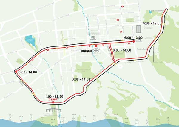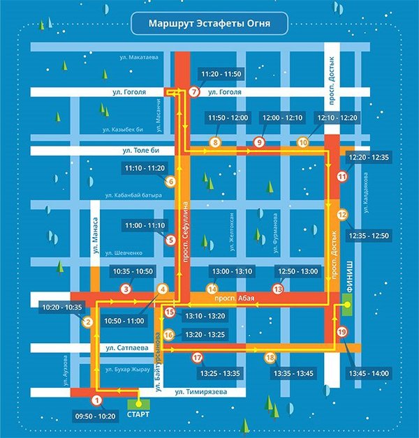 до 14.00 часов. В связи с тем, что Эстафета Огня охватывает большой квадрат улиц, корректировка автобусных маршрутов производиться не будет. Автобусные маршруты будут останавливаться по мере прохождения эстафеты по участкам. Таким образом, остановка каждого маршрута на указанных участках будет составлять в среднем 5—10 минут. : zakon.kz