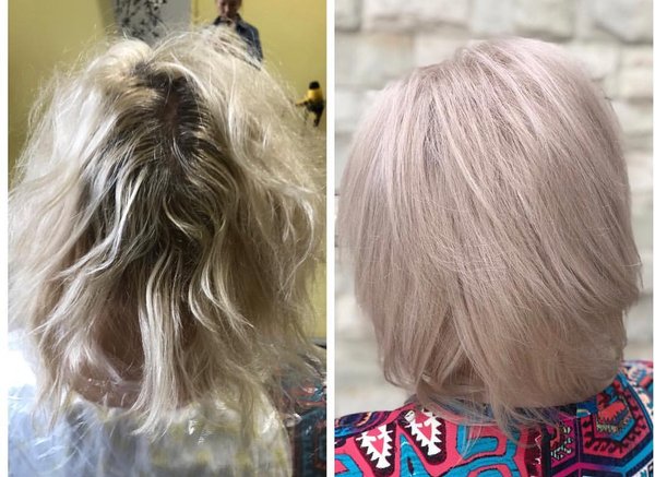 Sholpan Mamanova (21.06.2018): Окрашивание корней + тонирование длины Клиентка ранее делала мелирование, чтобы скрыть начинающие седеть корни, выбелила прядки до прозрачности, но к сожалению эффект был противоположен ожидаемому И тут в дело вступают мастера Дома Красоты «МАВ» ️ Мы углубили корни и закрасили белесое мелирование в нежно-персиковый цвет ️ Оценивайте, комментируйте, будем рады) ️ #