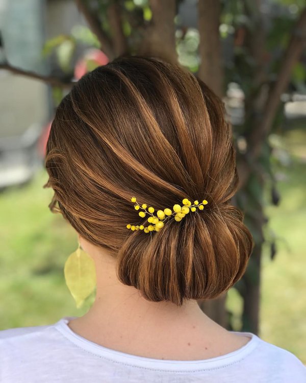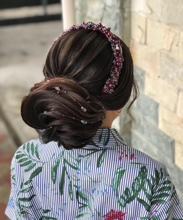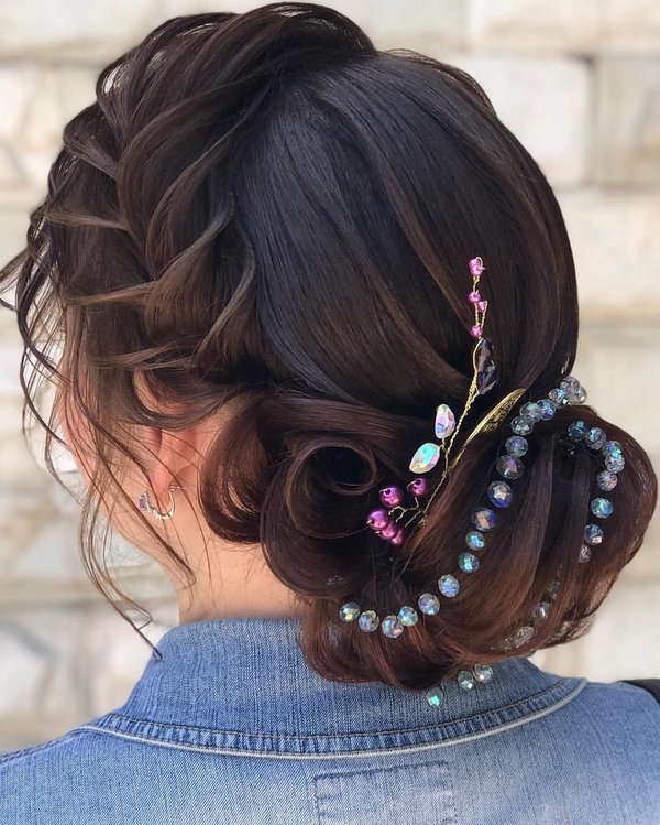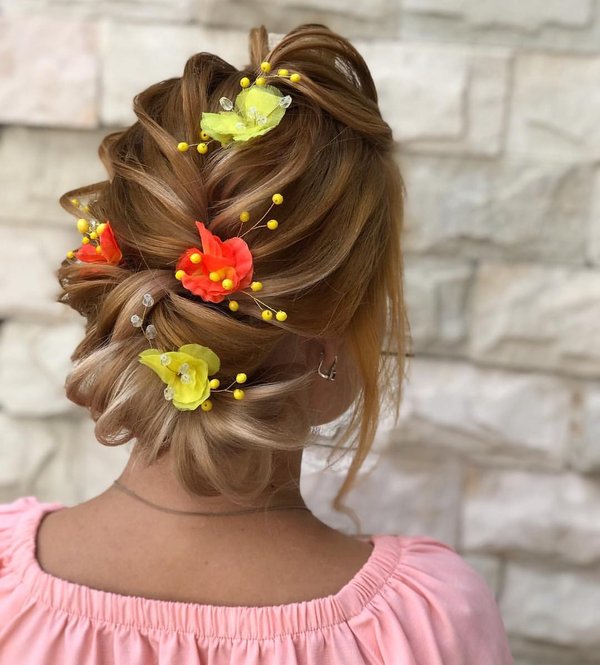Sholpan Mamanova (15.06.2018): Очень изящная прическа для солнечной выпускницы! Низкий пучок и текстуру прекрасно дополняет украшение в нежных цветах со сверкающими камнями! Мастер, как всегда, работала с душой, выкладываясь по полной! Всем хороших выходных и веселого времпрепровождения! #