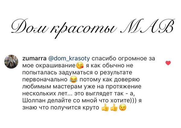 Sholpan Mamanova (08.07.2018): ️ Опровержение на тему создания нашими мастерами ржавчины на блондинках ️ Бежевый оттенок прекрасен в своей многогранности, он крайне переменчив в разной степени освещения да и камера, к сожалению никогда не передаст полноту цвета ️ Наши клиенты всегда довольны проведённой работой и рыженькими от нас выходят только по собственному желанию ️ Всем добра П.С.- второе фото не решились выкладывать из-за пушистых кончиков, знаем что хейтеры сразу начнут вопить из своих нор о сожженном волосе #