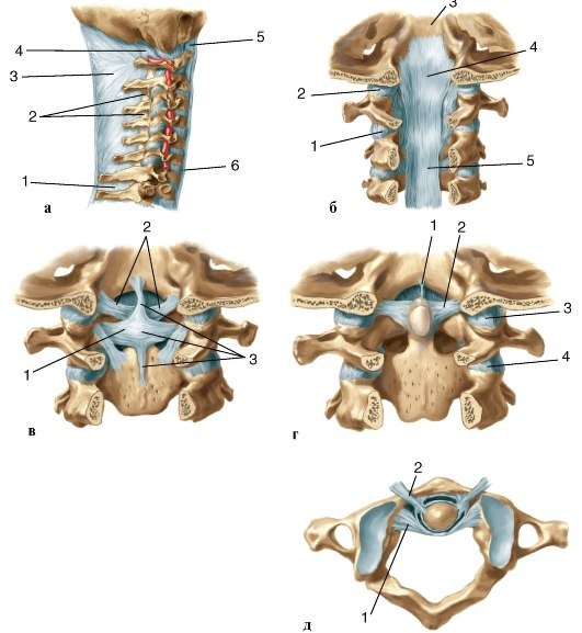 toaxial lateralis), расположенный между нижними суставными поверхностями атланта и верхними суставными поверхностями осевого позвонка; непарный цилиндрический срединный атлантоосевой сустав (articulatio atlantoaxialis medialis), между зубом осевого позвонка и суставной ямкой атланта. Суставы укреплены прочными связками. Между передней и задней дугами атланта и краем большого затылочного отверстия натянуты передняя и задняя атлантозатылочные мембраны (membranae atlantooccipitales anterior et posterior) (рис. 1). Между боковыми массами атланта перекидывается поперечная связка атланта (lig. trasversum atlantis). От верхнего свободного края поперечной связки проходит фиброзный тяж к передней полуокружности большого затылочного отверстия. От нижнего края той же связки вниз, к телу осевого позвонка, идет фиброзный пучок. Верхние и нижние пучки волокон вместе с поперечной связкой образуют крестообразную связку атланта (lig. cruciforme atlantis). От верхней части боковых поверхностей зубовидного отростка отходят две крыловидные связки (ligg. alaria), направляющиеся к мыщелкам затылочной кости. Рис. 1. Соединение шейных позвонков между собой и с черепом: а — шейный отдел позвоночного столба, вид с правой стороны: 1 — межостистая связка; 2 — желтые связки; 3 — выйная связка; 4 — задняя атлантозатылочная мембрана; 5 — передняя атлантозатылочная мембрана; 6 — передняя продольная связка; б — верхняя часть позвоночного канала, вид сзади. Удалены дуги позвонков и остистые отростки: 1 — латеральный атлантоосевой сустав; 2 — атлантозатылочный сустав; 3 — затылочная кость; 4 — покровная мембрана; 5 — задняя продольная связка; в — по сравнению с предыдущим рисунком удалена покровная мембрана: 1 — поперечная связка атланта; 2 — крыловидные связки; 3 — крестообразная связка атланта; г — по сравнению с предыдущим рисунком удалена крестообразная связка атланта: 1 — связка верхушки зуба; 2 — крыловидная связка; 3 — атлантозатылочный сустав; 4 — латеральный атлантоосевой сустав; д — срединный атлантоосевой сустав, вид сверху: 1 — поперечная связка атланта; 2 — крыловидная связка Анатомия человека. С. С. Михайлов, А. В. Чукбар, А. Г. Цыбулькин; под ред. Л. Л. Колесникова.