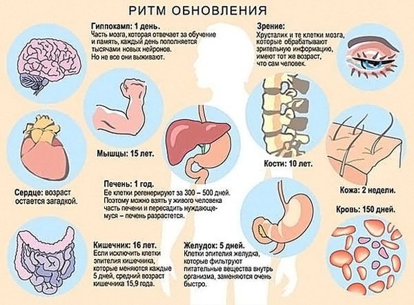 дной научно-популярной книги в другую кочует утверждение: наше тело почти полностью обновляется за семь лет. Старые клетки постепенно отмирают, их места занимают новые. Клетки действительно обновляются, но откуда взялась мифическая цифра семь, никто толком не знает. Для некоторых клеток срок обновления установлен более или менее точно, а именно: 150 дней для клеток крови, за постепенным замещением которых можно проследить после переливания крови, и две недели для клеток кожи, которые появляются в ее глубинных слоях, постепенно мигрируют на поверхность, отмирают и отшелушиваются. Обновление нашего организма происходит постоянно. За один день в нем появляются миллионы новых клеток, а миллионы старых отмирают. Быстрее всех обновляются клетки, которые контактируют с внешней средой. К примеру, клетки кожи обновляются в среднем за три недели, а клетки внутренних стенок кишечника (из которых состоят мельчайшие ворсинки, всасывающие питательные вещества из пищевых масс) за 3—5 дней. Клетки рецепторов на поверхности языка, которые помогают различать вкусы пищи, обновляются каждые 10 дней. Кровяные клетки эритроциты — обновляются в среднем за 120 дней, поэтому, чтобы видеть картину изменений в нашем организме, рекомендуют делать раз в полгода общий анализ крови. Клетки печени обновляются за 300—500 дней. Если отказаться от алкоголя, не есть жирного и острого, не принимать лекарства, печень может полностью очиститься за 8 недель. Кстати, печень единственный орган в нашем теле, который способен полностью восстанавливаться при потере 75% своей ткани. Альвеолы (воздушные мешочки, находящиеся на концах бронхов) возобновляются в течение одного года, а клетки на поверхности легких каждые 2—3 недели. Костная ткань обновляется постоянно сращение костей после переломов происходит именно за счет ее регенерации. Но для того, чтобы полностью обновился наш скелет, необходимо от 7 до 10 лет. Ногти на руках отрастают на 3—4 мм в месяц, а волосы в среднем — на один сантиметр. Полностью смениться волосы могут за несколько лет, в зависимости от их длины. Считается, что у мужчин смена волос происходит за три года, а у женщин это цикл может достигать семи и более лет. Чем сложнее строение ткани и ее функция, тем длительнее процесс ее регенерации. В нашем теле наиболее сложной по строению считается нервная ткань. И хотя раньше ученые были уверены, что она не восстанавливается, в настоящее время выявлено, что и в ней возможны регенеративные процессы. Головной мозг, хрусталики глаз и сердце, также хранят множество нераскрытых загадок для ученых, так как эти органы до конца еще не изучены. На данный момент ученые считают, что их процесс регенерации очень сложен и практически невозможен. Фрисена как невролога больше всего, разумеется, интересует головной мозг. Из исследований, проведенных на животных, а также на одном пациенте, умиравшем от рака и согласившемся на введение ему в мозг слабо радиоактивного изотопа, известно, что после рождения новые нейроны возникают только в двух областях в гиппокампе и вокруг желудочков мозга. Пока новым методом измерен возраст лишь немногих участков головного мозга. По данным Фрисена, клетки мозжечка моложе самого человека в среднем на 2,9 года. Мозжечок, как известно, отвечает за координацию движений, а она постепенно улучшается с воз