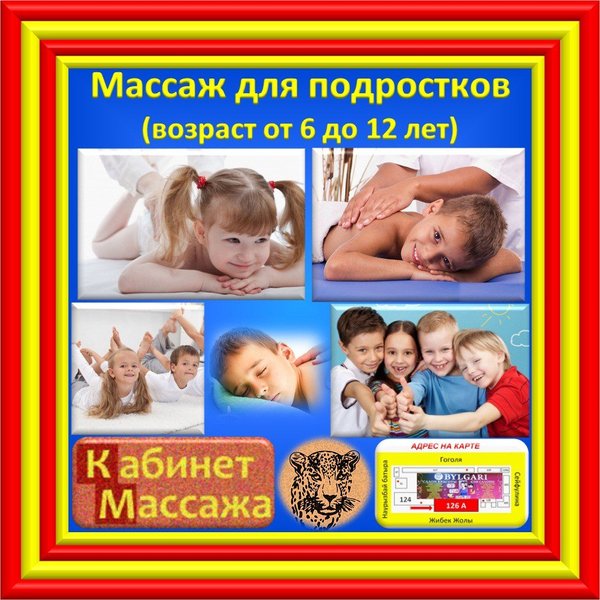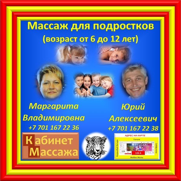 Подростковый массаж. Консультация и запись на массаж по телефонам: Юрий Алексеевич) Маргарита Владимировна) Адрес нашего кабинета массажа: г. Алматы, Жибек Жолы 126 А (уг.ул. Сейфуллина) Салон красоты «BYLGARI» Больше информации: С НОВЫМ ГОДОМ!!! Будем рады любым комментариям и замечаниям с Вашей стороны!