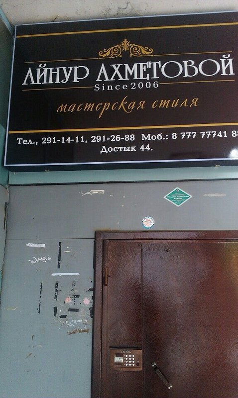 Адрес мастерской стиля Айнур Ахметовой: Казахстан, Алматы, Достык проспект, 44.