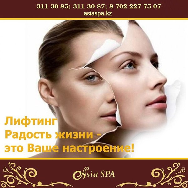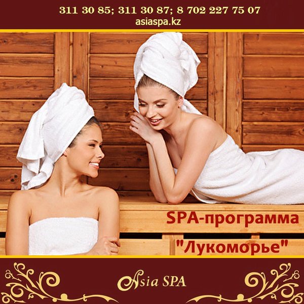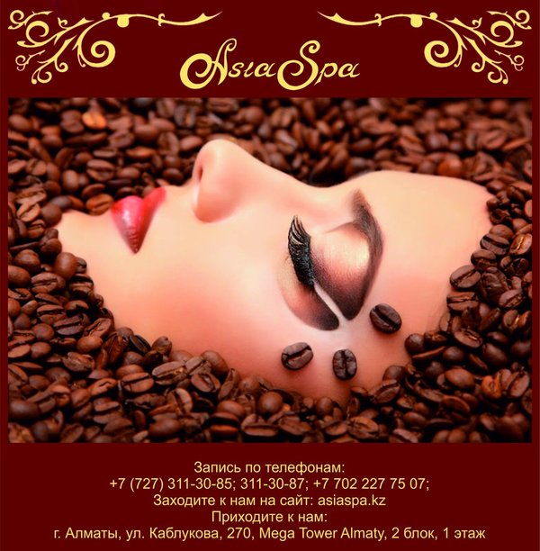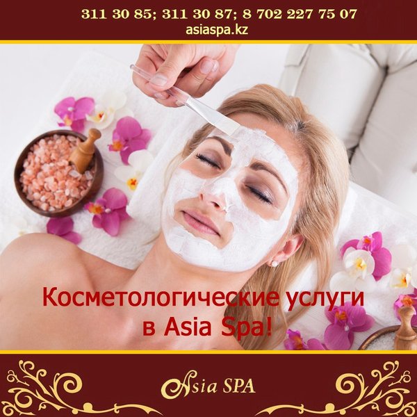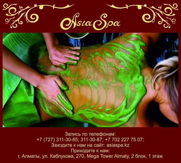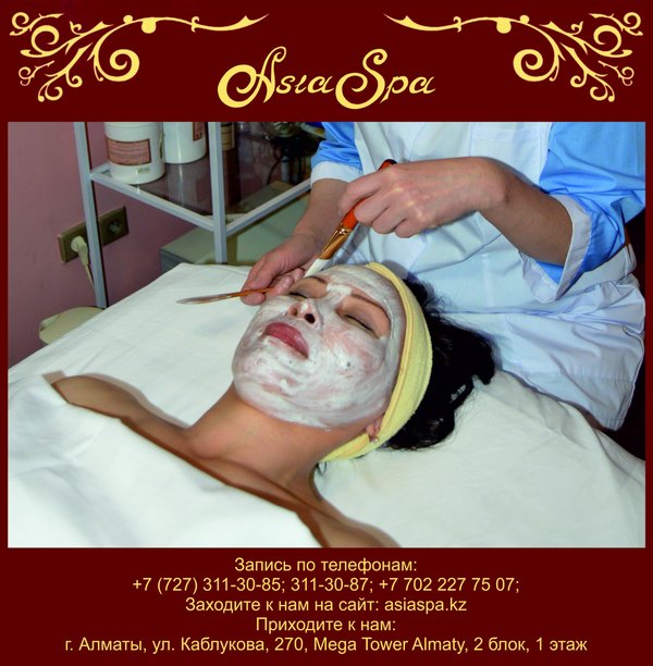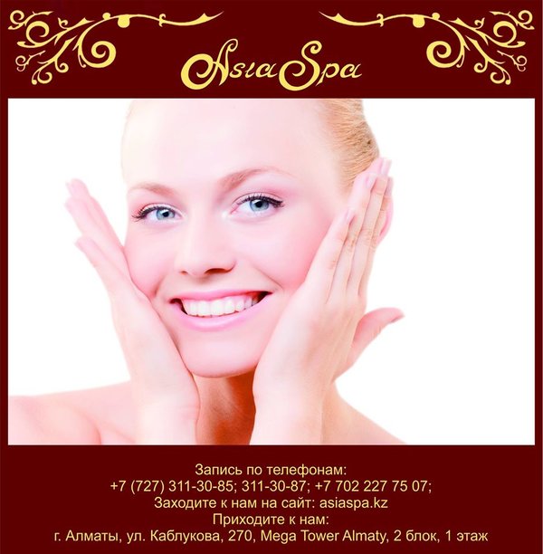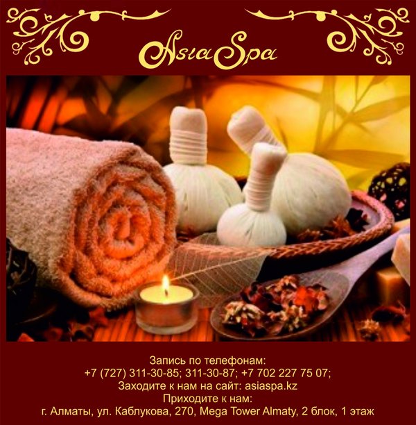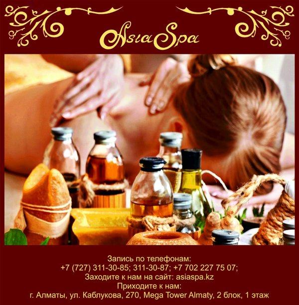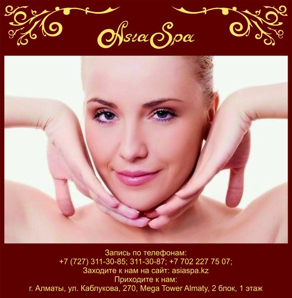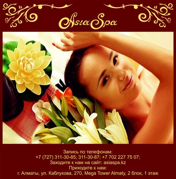 ненная проблема для молодых мам и офисных работников); повышение упругости и гладкости кожи; подтягивание овала лица; эффективную борьбу с морщинами и синяками; уменьшение пигментации отдельных участков тела, выравнивание тона лица. Наряду с такими полезными особенностями стоит отметить, что спа сеансы еще и очень приятны, поэтому и пользуются повышенным спросом. Ведь, согласитесь, в сравнении с оперативным вмешательством спа предложения не имеют никакого риска и опасности для вашего здоровья, поэтому их можно применять практически всем. Наши специалисты помогут Вам убедится в этом! *** Подробная информация по телефонам:, 311-30-87; На нашем сайте: asiaspa.kz; Приходите к нам в салон: г. Алматы, ул. Каблукова, 270, Mega Tower Almaty, 2 блок, 1 этаж.