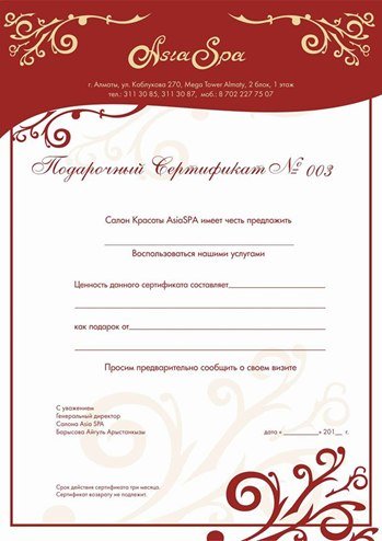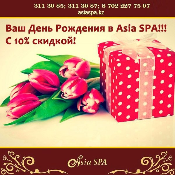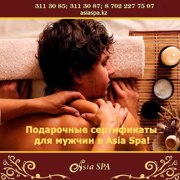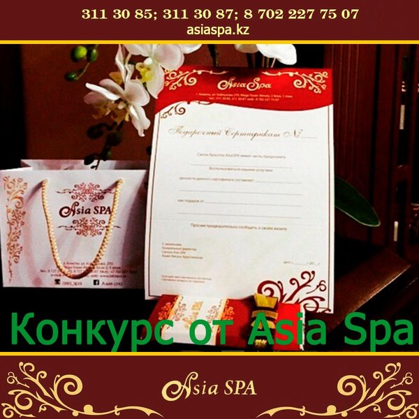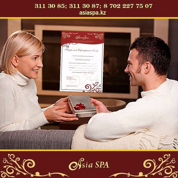 Хотите устроить для своего близкого человека незабываемы выходные? Тогда подарите наш сертификат на любую СПА-программу! Приятный отдых, неимоверные ощущения, хорошее настроение и огромную пользу для здоровья, получателя подарка, гарантируем! Подробнее можете узнать — На нашем сайте: asiaspa.kz — Позвонив к нам в салон:, 311-30-87 — Или приходите к нам в салон по адресу: г. Алматы, ул. Каблукова, 270, Mega Tower Almaty, 2 блок, 1 этаж.