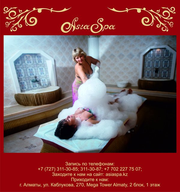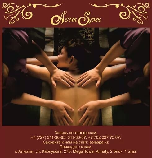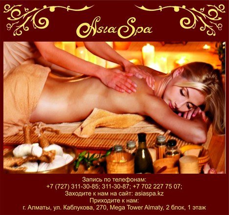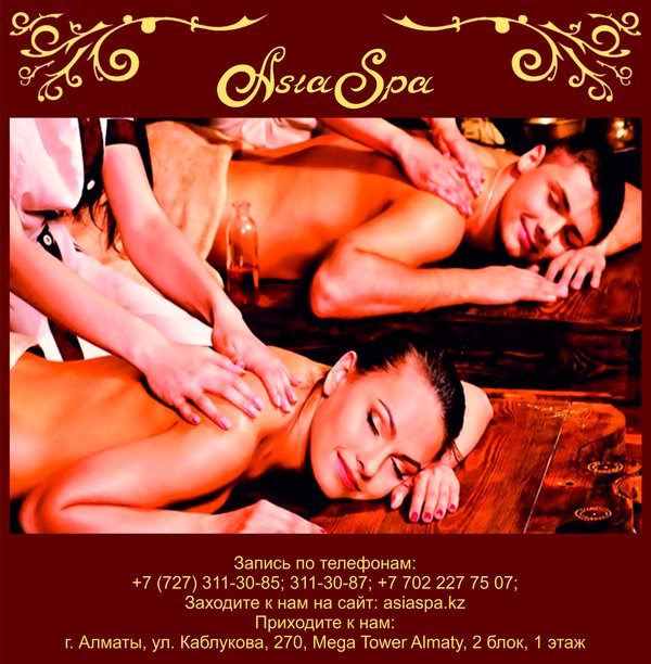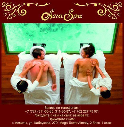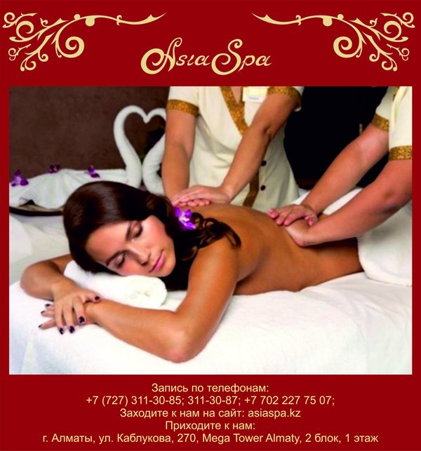 нервная система, а так же происходит воздействие на суставы, сухожилия и связки Происходит терапия сразу многих заболеваний вышеперечисленных систем и органов. Но самое главное, что это приносит незабываемое удовольствие и умиротворение. Наши мастера готовы познакомить Вас со всеми прелестями «королевского массажа». *** Запись по телефонам:, 311-30-87; Заходите на наш сайт: asiaspa.kz; Приходите в наш салон: г. Алматы, ул. Каблукова, 270, Mega Tower Almaty, 2 блок, 1 этаж.