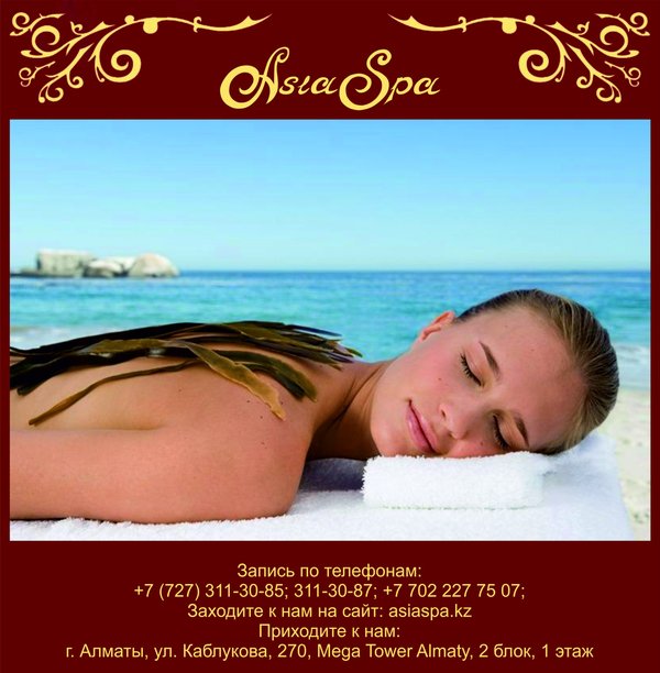 ями на талии и бедрах. И если проводить комплекс процедур одновременно, то вы станете несколько худее уже после первого посещения салона. Мастера нашего салона ждут Вас, чтобы познакомить со всеми прелестями талассотерапии! *** Запись по телефонам:, 311-30-87; Заходите на наш сайт: asiaspa.kz; Приходите к нам: г. Алматы, ул. Каблукова, 270, Mega Tower Almaty, 2 блок, 1 этаж.