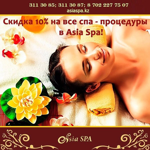 одрость на долгое время. Торопитесь, ведь у нас сейчас идут скидки на спа-процедуры! *** Запись по телефонам:, 311-30-87, Заходите на наш сайт: asiaspa.kz Приходите к нам: г. Алматы, ул. Каблукова, 270, Mega Tower Almaty, 2 блок, 1 этаж