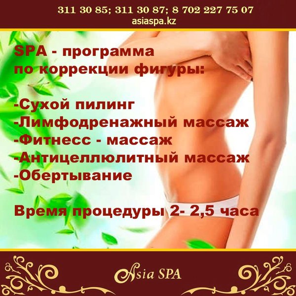 Нужна идеальная фигура к весне? Тогда спешим записаться к нам в салон на SPA — программу по коррекции фигуры Что входит в программу по коррекции фигуры длительностью 2,5 часа? 1. Сухой пилинг 2. Лимфодренажный массаж 3. Фитнесс — массаж 4. Антицеллюлитный массаж 5. Обертывание Время процедуры 2- 2,5 часа Стоимость процедуры — 20000 тг. Количество процедур 10—12. При оплате за 10 процедур, Вы получаете 2 процедуры в подарок. Бесплатная консультация и презентация 15 минут. Красивая фигура это один из признаков здоровья.
