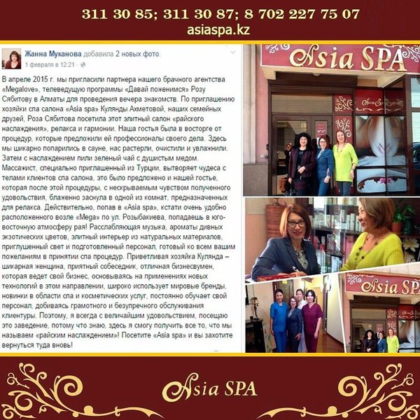 ожете узнать по телефонам:, 311-30-87. На нашем сайте: asiaspa.kz. Приходите к нам в салон: г. Алматы, ул. Каблукова, 270, Mega Tower Almaty, 2 блок, 1 этаж.