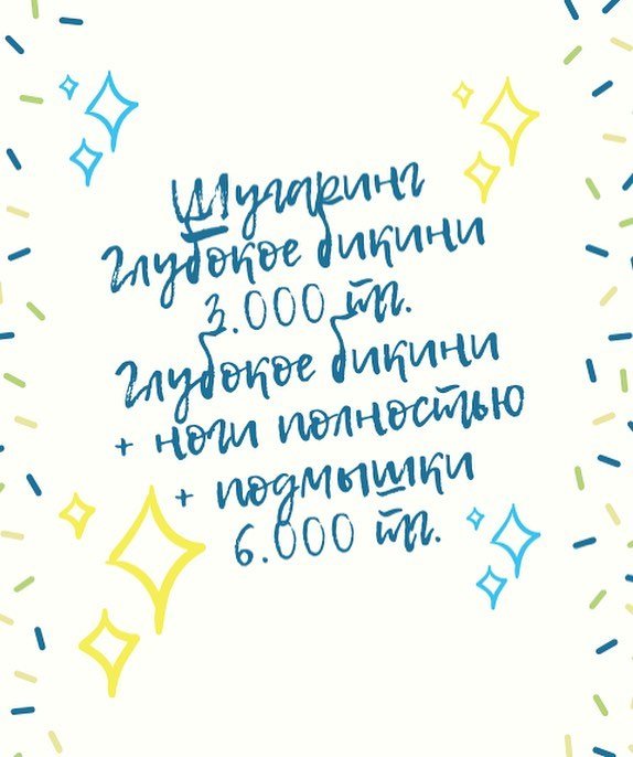 Подмышки 1.000 тг. Руки до локтя 1.500 тг. / полностью 2.500 тг. Ноги до колен 2.000 тг. / с коленкой 2.500 тг. / полностью 3.000 тг. Глубокое бикини 3.000 тг. Глубокое бикини + ноги полностью + подмышки в подарок = 6.000 тг. ул. Курмангазы 72 (уг. ул. Желтоксан) ️ ️