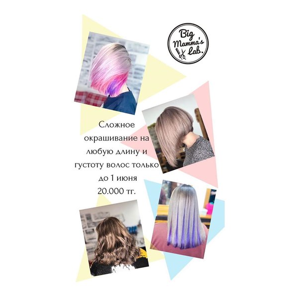 Скрытое окрашивание все больше набирает популярность,ведь с ним можно быть скромной или яркой по своему желанию Сложное окрашивание + тонировка от 8.000 тг. за работу Укладки от 3.000 тг. Прически от 4.000 тг. Плетение кос от 2.000 тг. ️ Женская стрижка 3.000 тг. Мужская стрижка 2.000 тг. ️ Локоны от 4.000 тг. Окрашивание волос от 4.000 тг. (работа) ул. Курмангазы 72 (уг. ул. Желтоксан) ️ ️